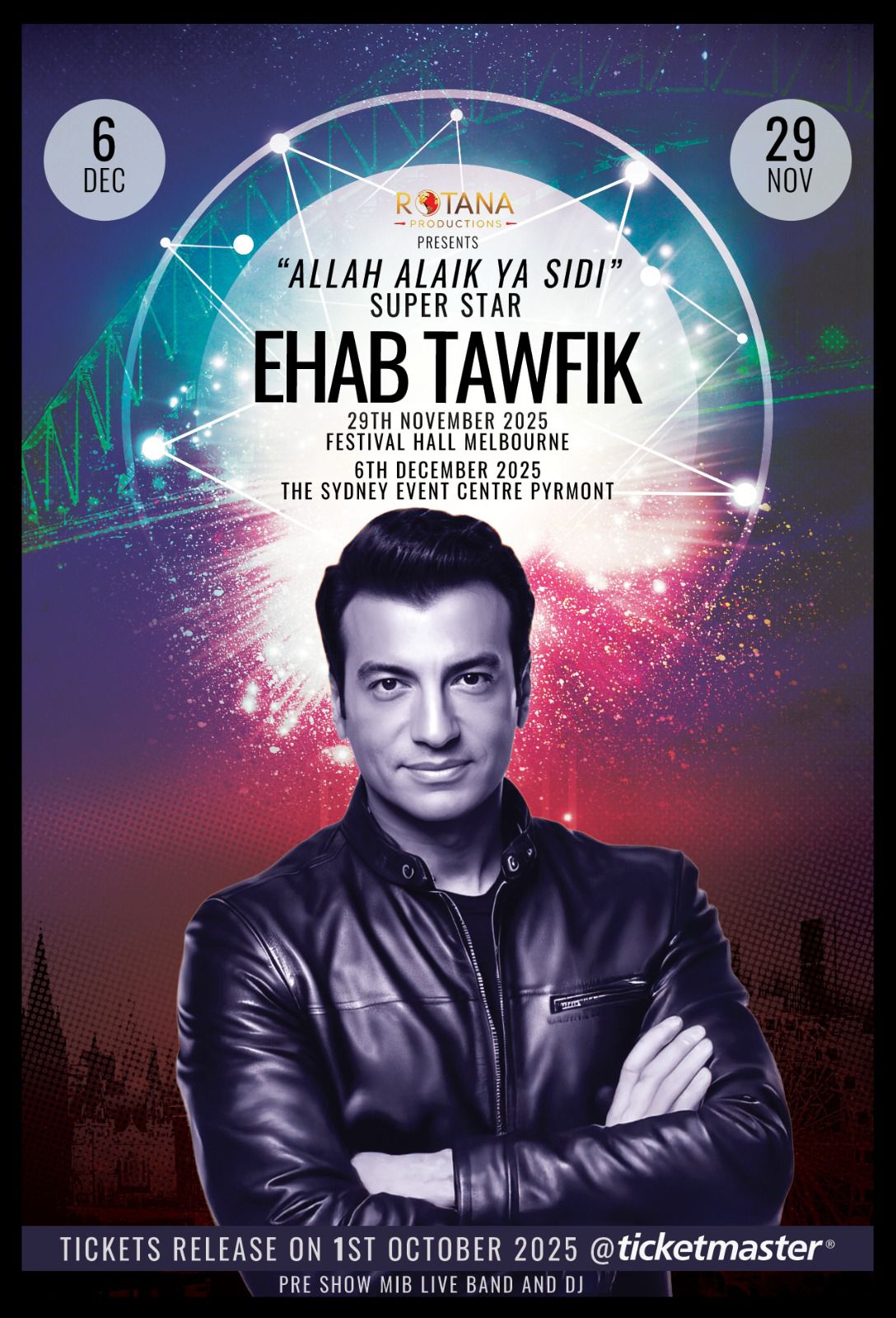 All the way from Egypt, the legendary voice of Arabic pop, Ehab Tawfik, will perform live at The Sydney Event Centre, Pyrmont on Saturday, 6th December 2025.